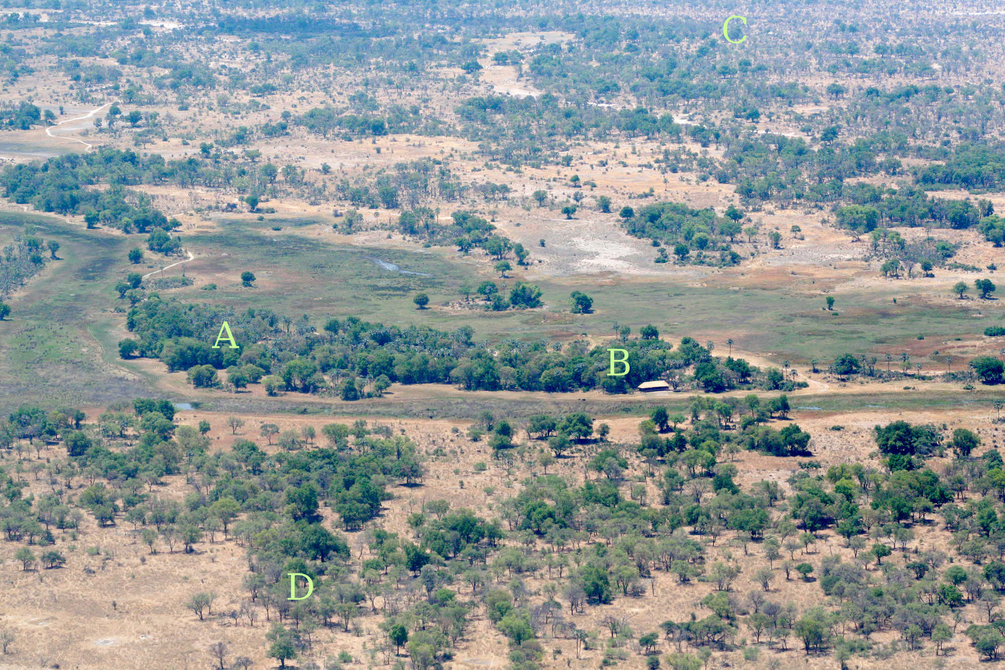 In the main camp, people looked out over the riverbed towards the west, to the left of "A" in the photo. In Lediba, we looked out to the south, over the riverbed "this side" of the lodge in this picture. (See the next photo for more details.) The airstrip serving the camp was 7km to the north, i.e. in the direction of "C".